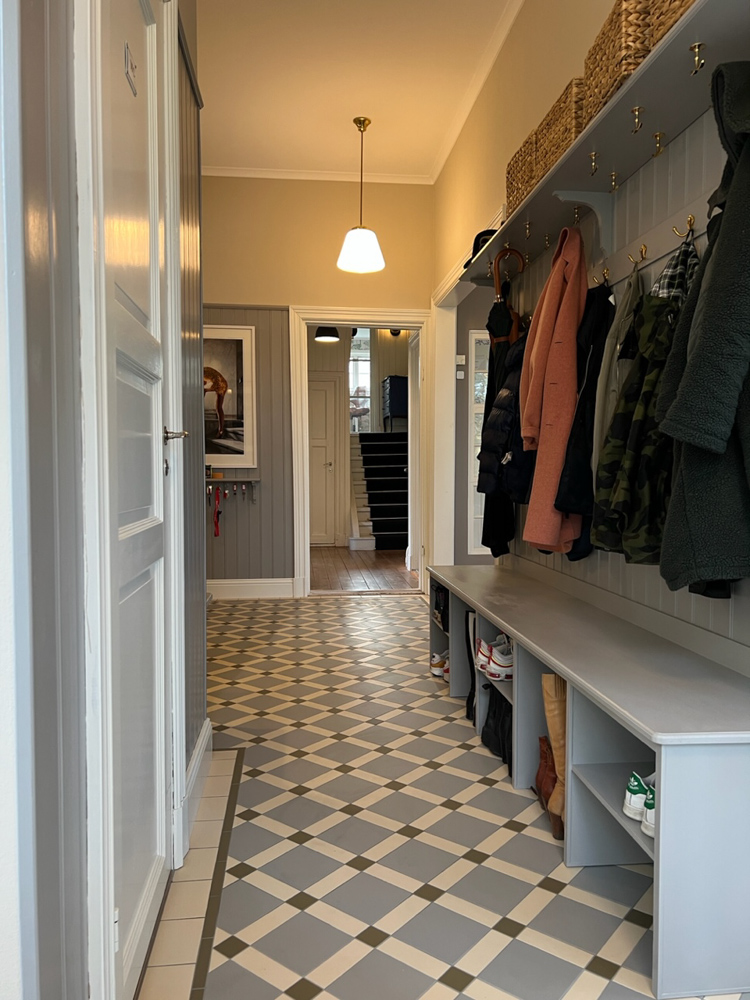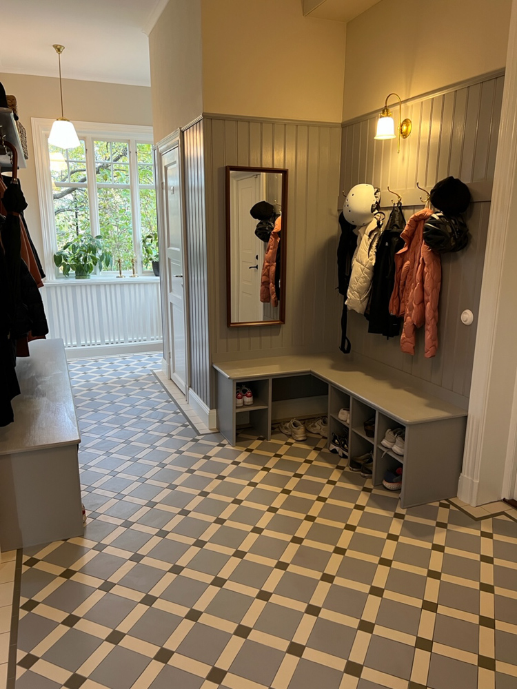 I Svenska hem började dessa plattor användas i stor skala från och med 30-talet, men då ofta med det enklare schackrutiga mönstret som är en självklar del av funkisstilen.
