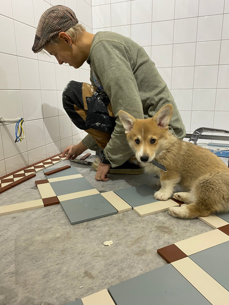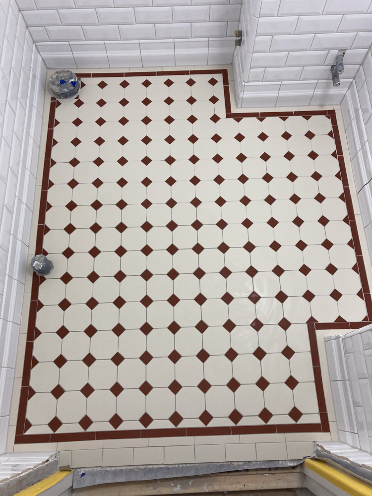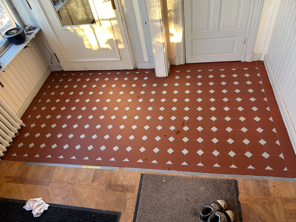 När jag lägger de engelska mönstren ägnar jag mycket tid åt de förberedande uträkningarna och mätning. När väl första plattan ligger är alla plattor i hela mönstret bestämt. Jag blir lika ledsen varje gång någon mailar mig bilder på ett havererat mönster som en oerfaren plattsättare lagt, med frågan om golvet går att rädda. Ett ogenomtänkt lagt mönster eller en illa utmätt symmetri går inte att rädda upp. Plattorna ligger där de ligger och kan inte brytas upp och återanvändas.